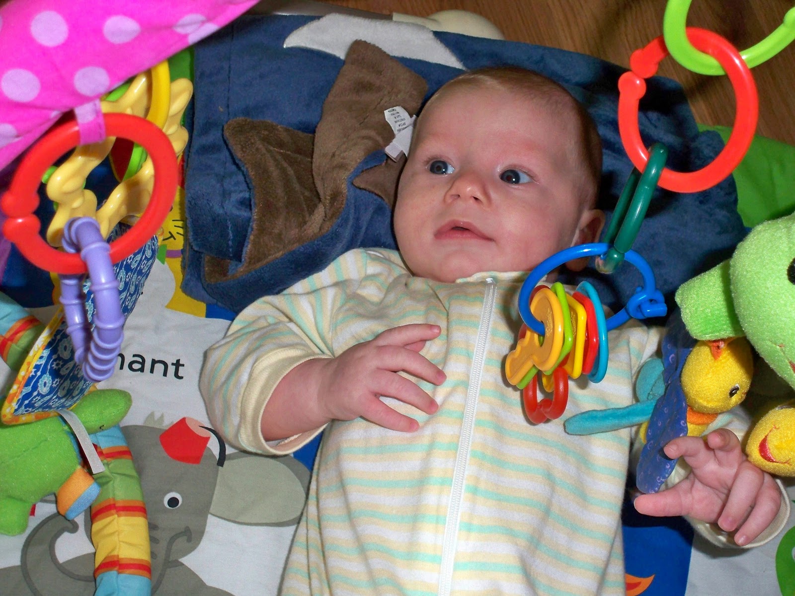 Here are just a few pics and videos of the boy! He's reaching for things, and becoming more vocal, but still is just such an easy-going little guy. He loves being in my Beco baby carrier and falls asleep within minutes of me putting him in it- it's SO much nicer than hauling him around in that carseat that he hates so much! Now, if I can just figure out how to get him to sleep in his pack and play....we'll save that for next month. :)