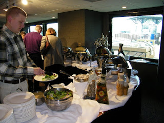 The buffet dinner had rolls, salad, chicken salad, pasta salad, fried chicken, mashed potatoes, turkey and gravy, three-cheese pasta, mixed veggies, and sole stuffed with crab. Then we got a dessert plate with 4 little desserts on it. It was awesome!