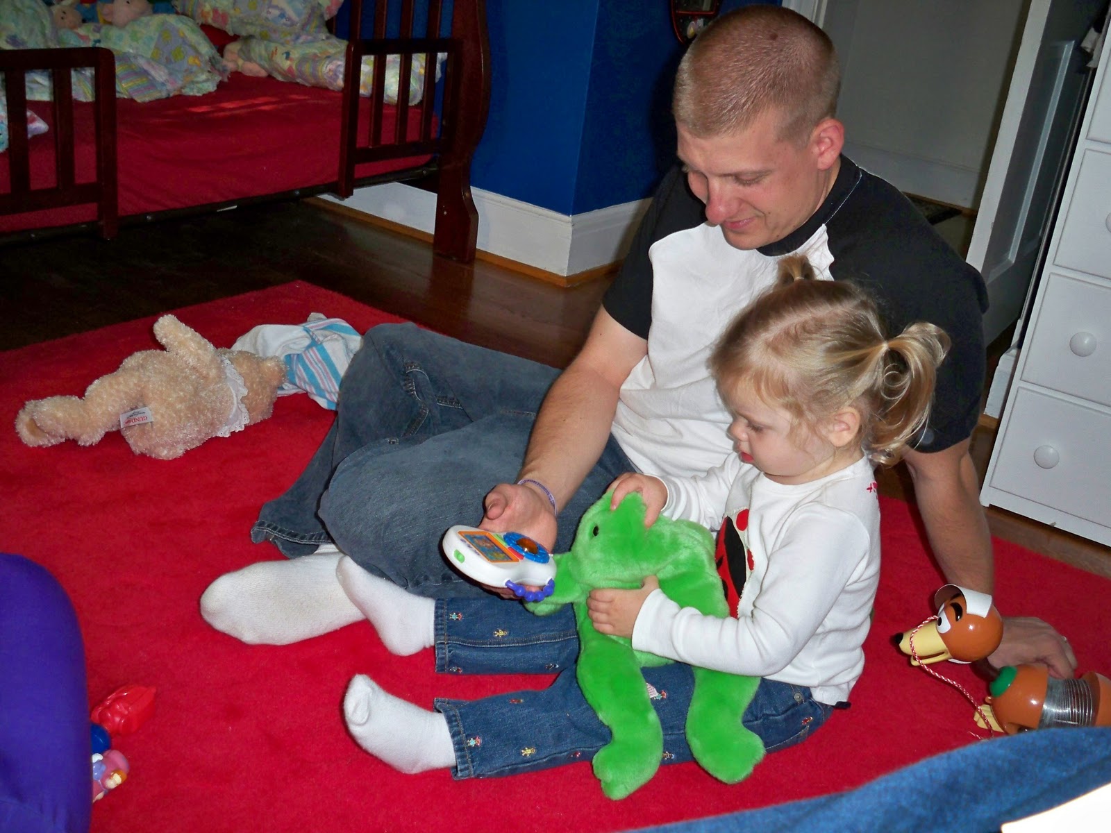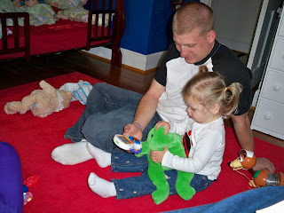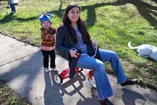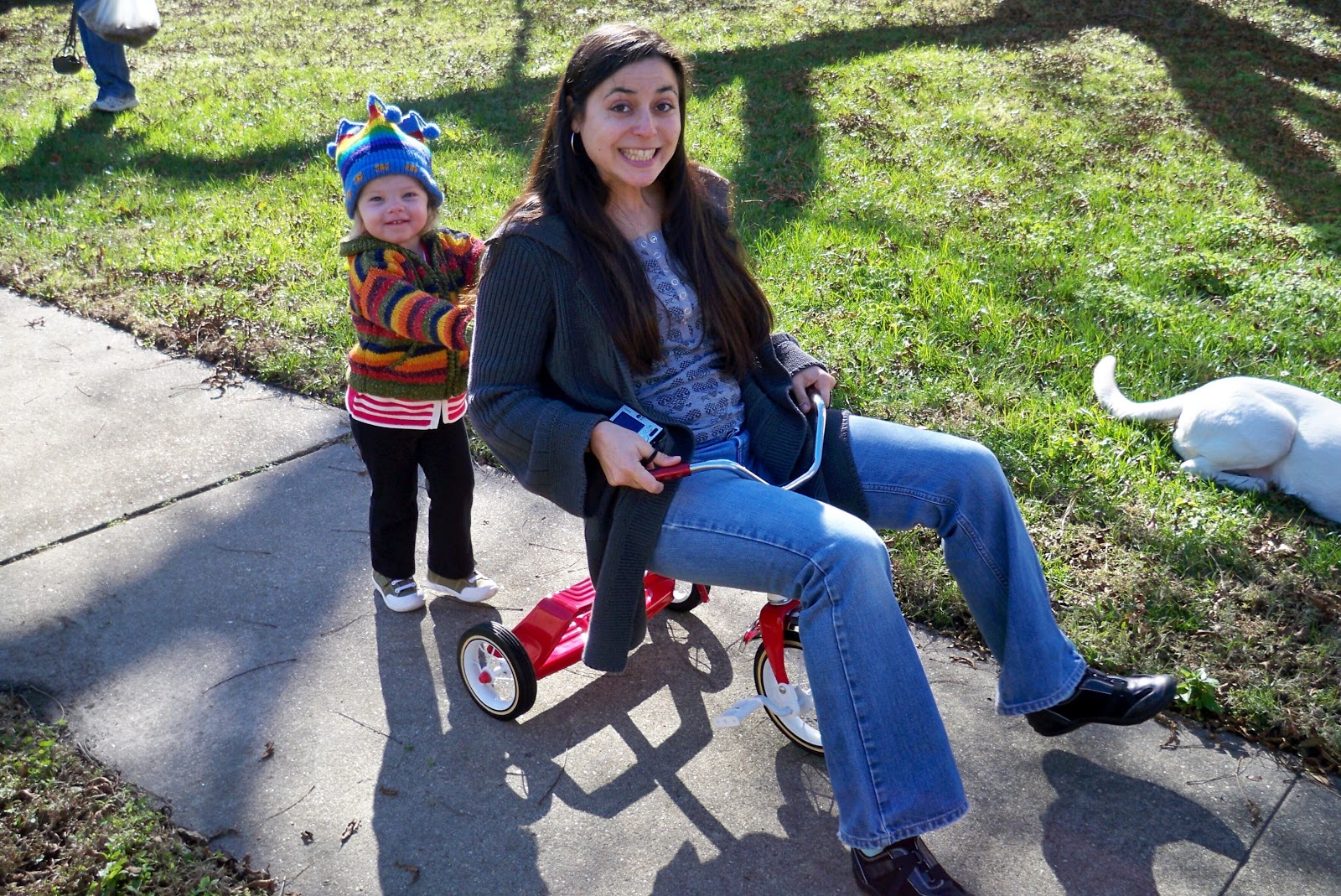 She'd rather push Nina on the tricycle than ride it!