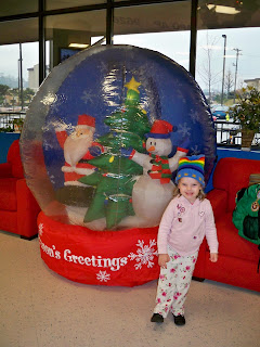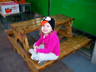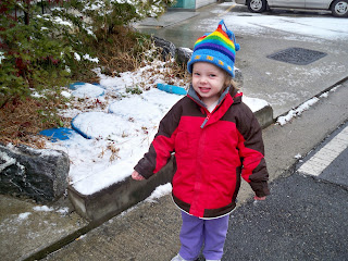 On a walk with her new penguin hat on. She kept saying "It's a great day for a penguin hat!"