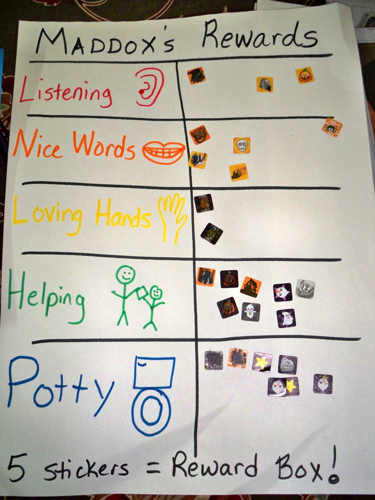 This was Maddox's first reward chart. It worked pretty well, but we were running out of space and Halloween stickers. So....